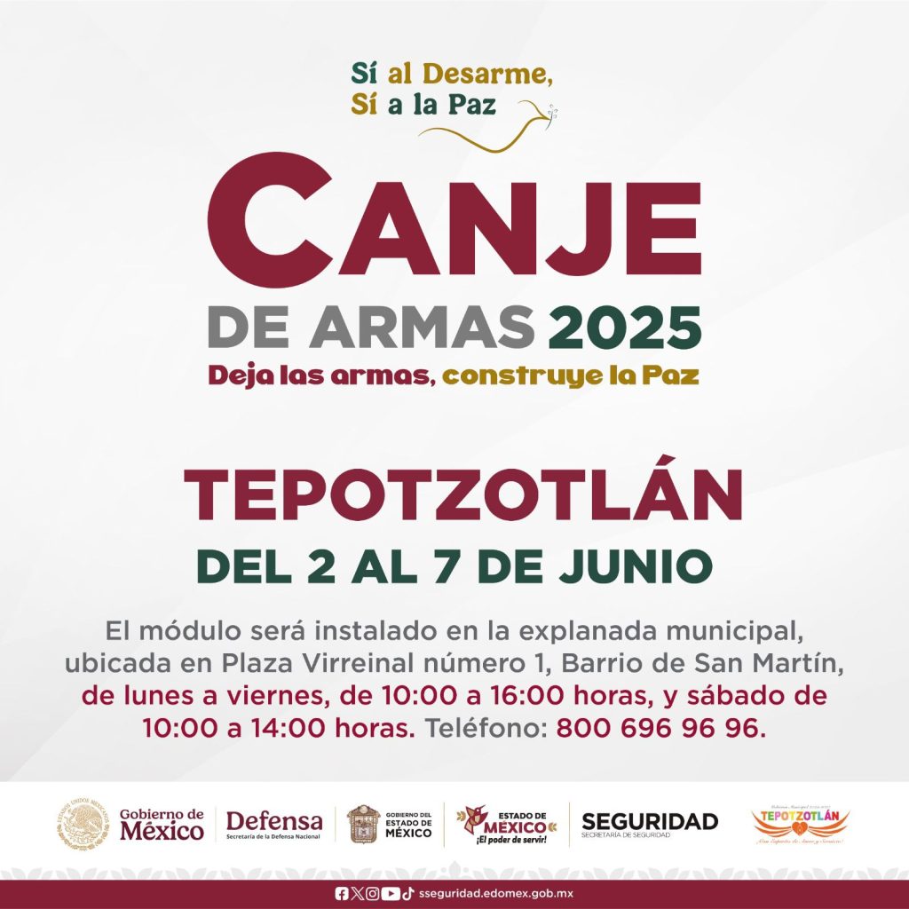 En coordinaciรณn con los gobiernos estatal y federal, por medio de la Secretarรญa de Seguridad del Estado de Mรฉxico y la Secretarรญa de la Defensa Nacional (SEDENA), respectivamente, el Ayuntamiento de Tepotzotlรกn realizarรก el Programa de Canje de Armas 2025 del 2 al 7 de junio, en la Plaza Virreinal 1, Barrio San Martรญn (frente al Palacio Municipal).