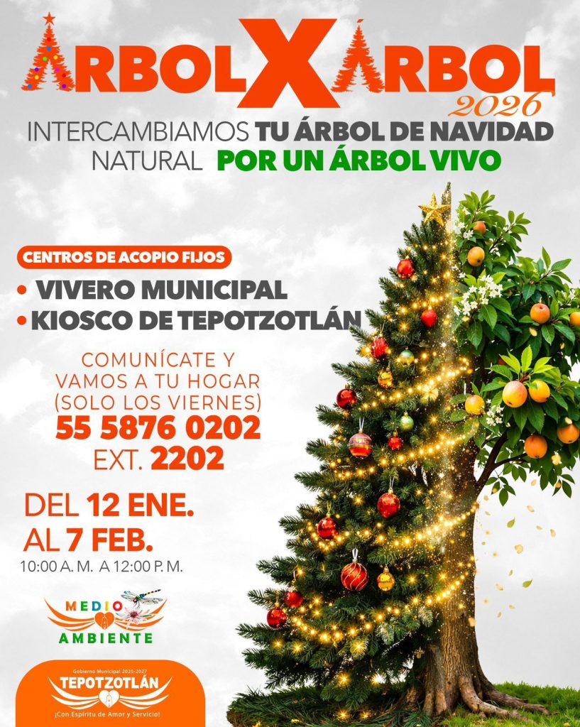 Con el objetivo de fomentar la cultura ambiental, la correcta disposición de residuos orgánicos y la reforestación responsable, el Ayuntamiento de Tepotzotlán, encabezado por la Presidenta Municipal María de los Ángeles Zuppa Villegas, invita a la ciudadanía a participar en la Campaña “Árbol por Árbol”, mediante la cual se intercambian árboles navideños naturales por árboles vivos.