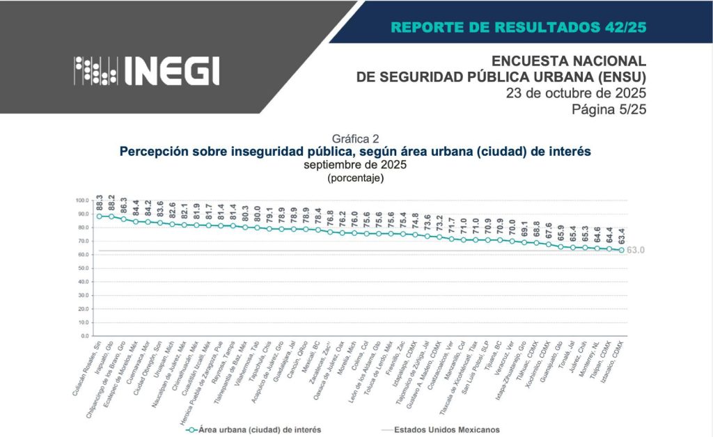 De acuerdo a ENSU, en comparación con 2024 que Naucalpan registró 89.2% de percepción de inseguridad, en junio de 2025, registró una disminución de 6 puntos, con el 83.3% y en octubre se mantiene a la baja con 82.1%.